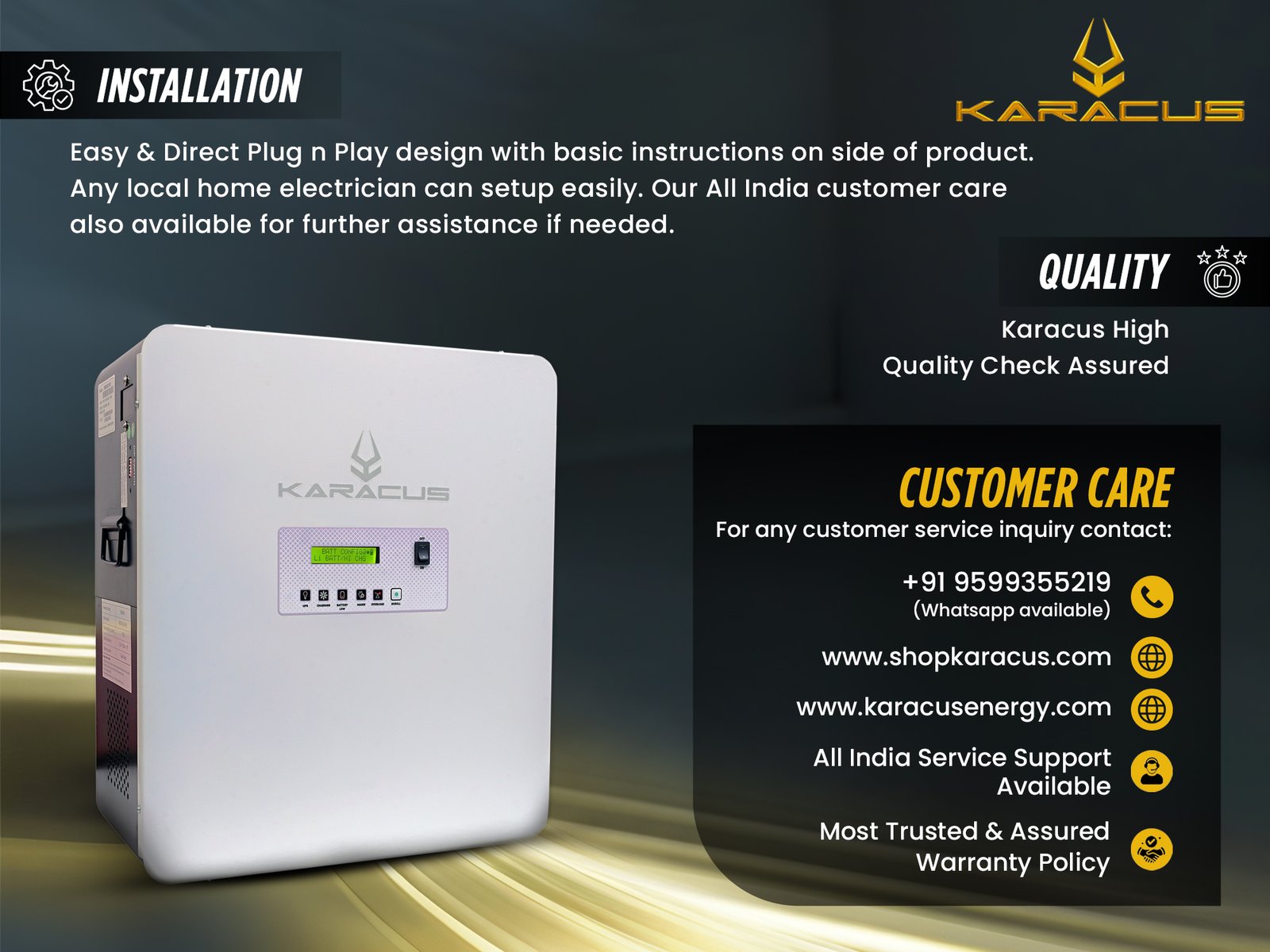 As an Architect was looking for a space saving compact inverter which is also aesthetically good… got everything in Karacus… it’s been a week and working absolutely fine.. wall mounting design was much needed and they got it well